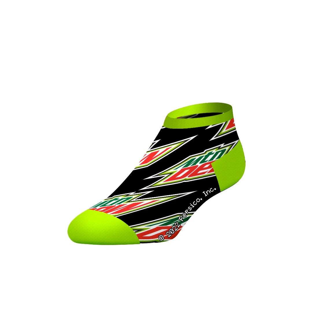 has four pairs of low-cut socks. The lime green pair of socks with mountain dew logos all over the socks. The lime green and black plain pattern pair is the second type of socks in the pack. The third pair of socks in the pack is black with lime green patterns and a mountain dew logo. And the fourth pair is a plain white low-cut sock that is given for free when you buy a